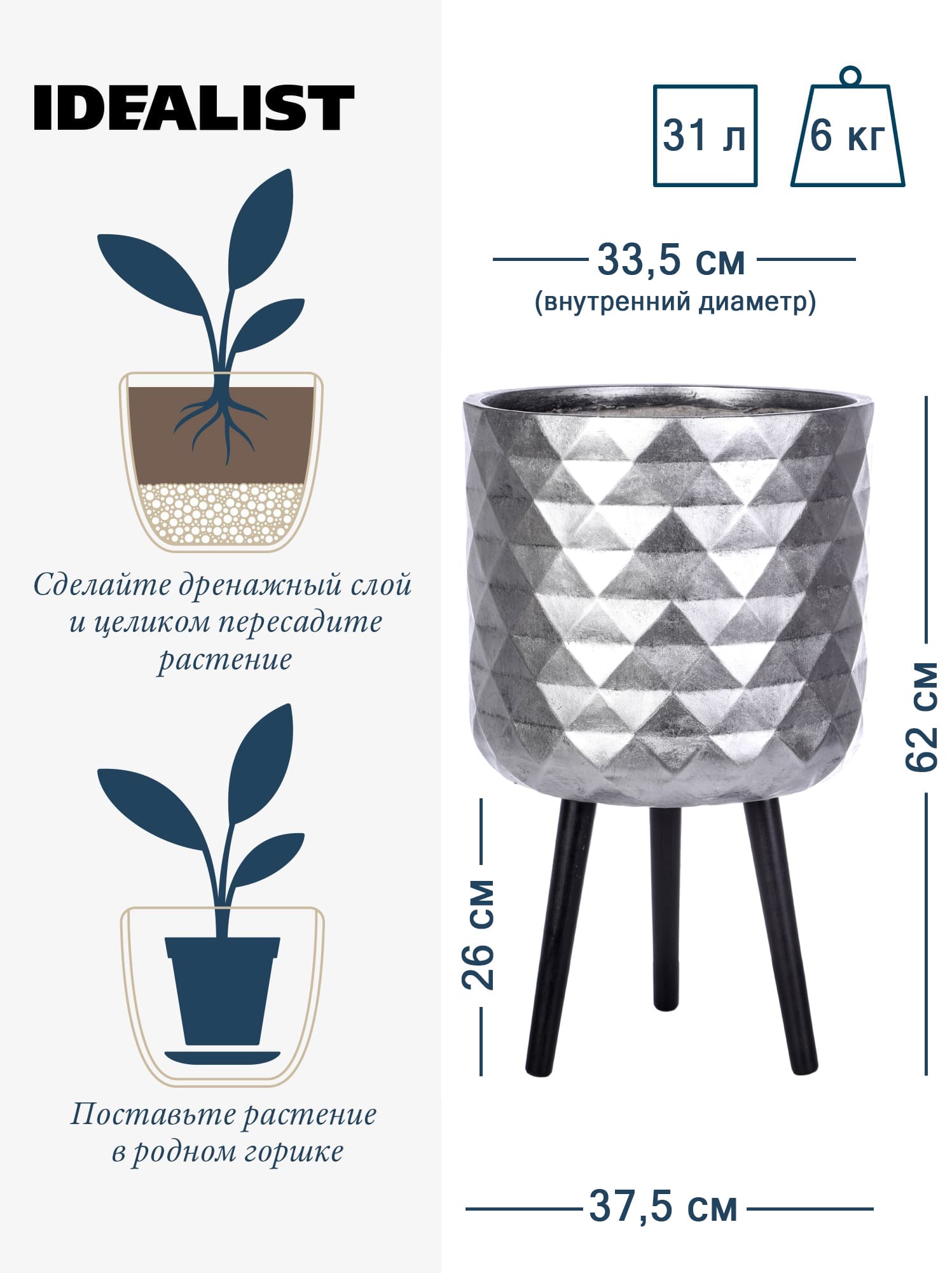 Напольное кашпо для цветов IDEALIST Даймонд, серебристое, Д37,5 В62 см, 31 л, 5.9 кг