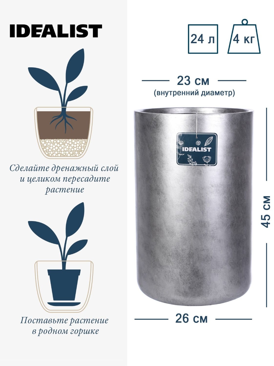 Напольное кашпо для цветов IDEALIST Крисмас, круглое, серебристое, Д26 В45 см, 24 л, 4 кг