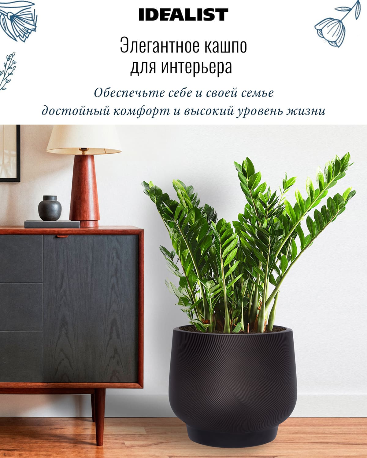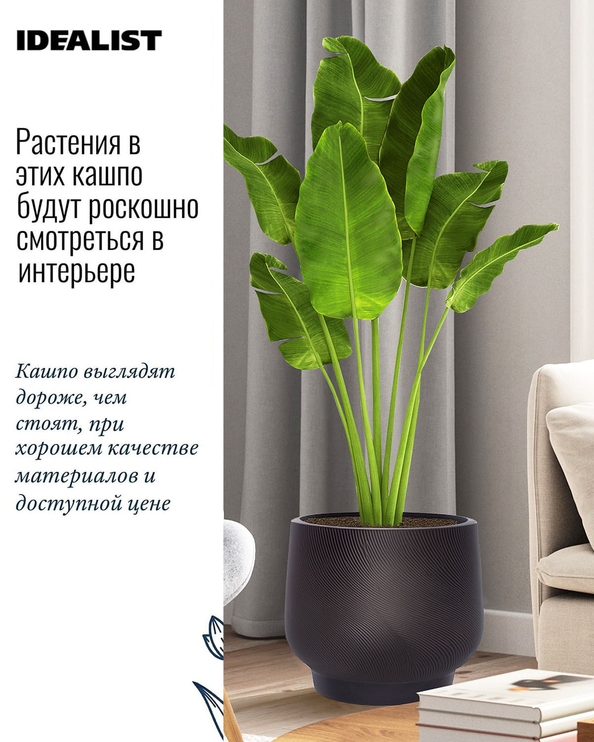 В кашпо IDEALIST можно сажать комнатные растения, которые растут в грунте (не гидропоника). Также можно сажать сезонные уличные растения, например, петунии или гортензии.