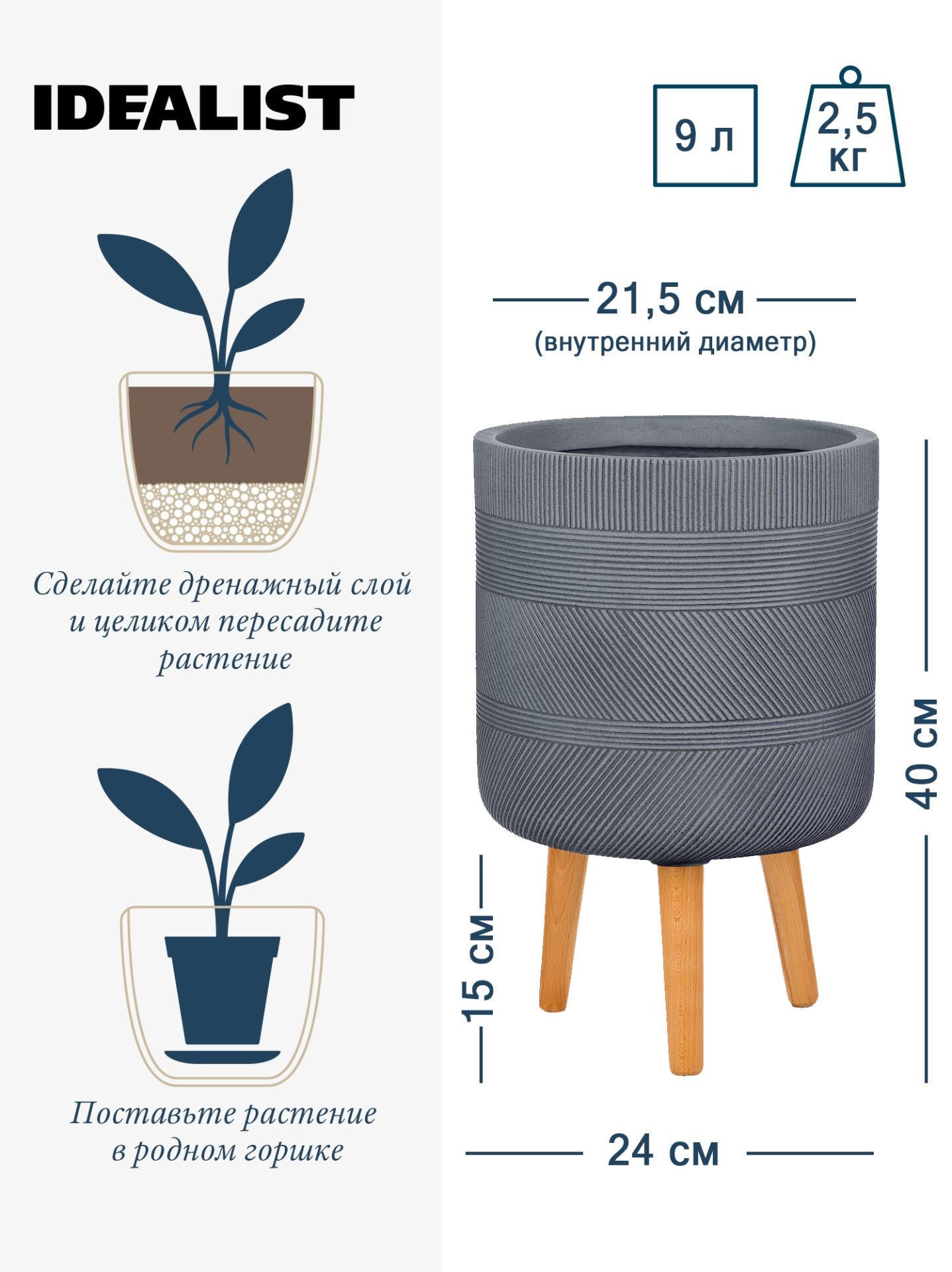 На дне кашпо (кроме моделей на ножках) есть метки для дренажных отверстий. Но просверливать их не обязательно. Вместе с кашпо вы получите печатную инструкцию с разными вариантами посадки, где не нужно утруждать себя сверлением.