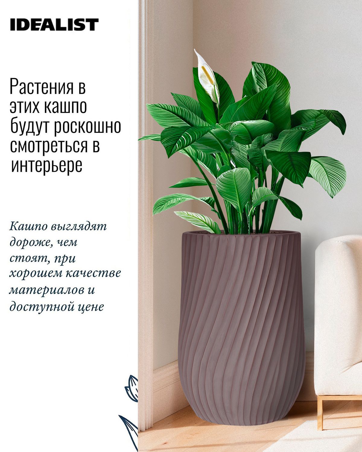 В кашпо IDEALIST можно сажать комнатные растения, которые растут в грунте (не гидропоника). Также можно сажать сезонные уличные растения, например, петунии или гортензии.