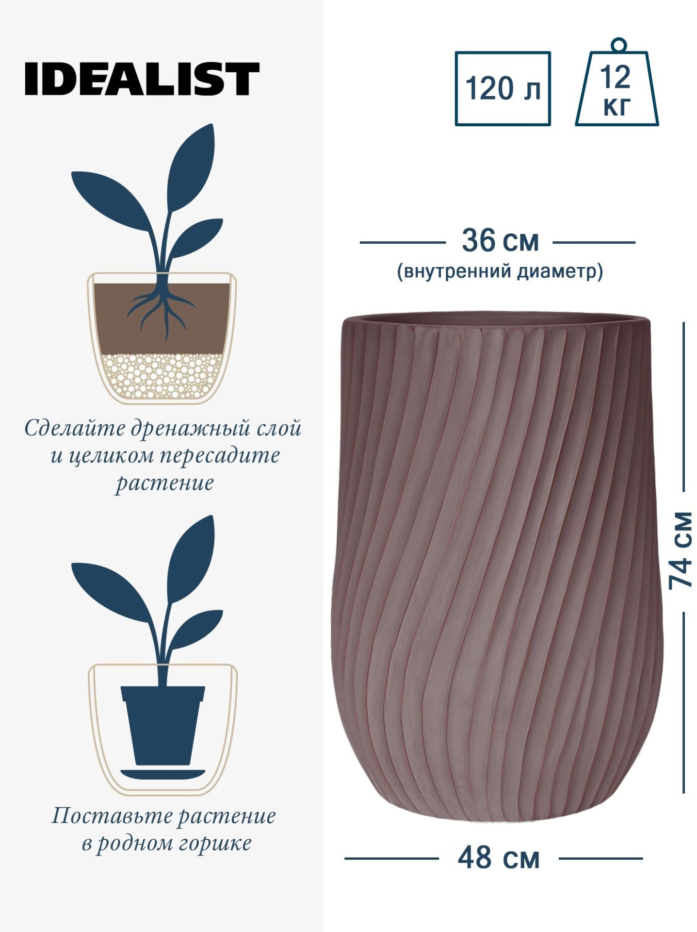 Обратите внимание, что гарантийные обязательства, правила и порядок удовлетворения гарантийных случаев, требований возврата и обмена зависят от маркетплейса приобретения кашпо IDEALIST. В случае возникновения недоразумений, пожалуйста, свяжитесь с нами по телефону: