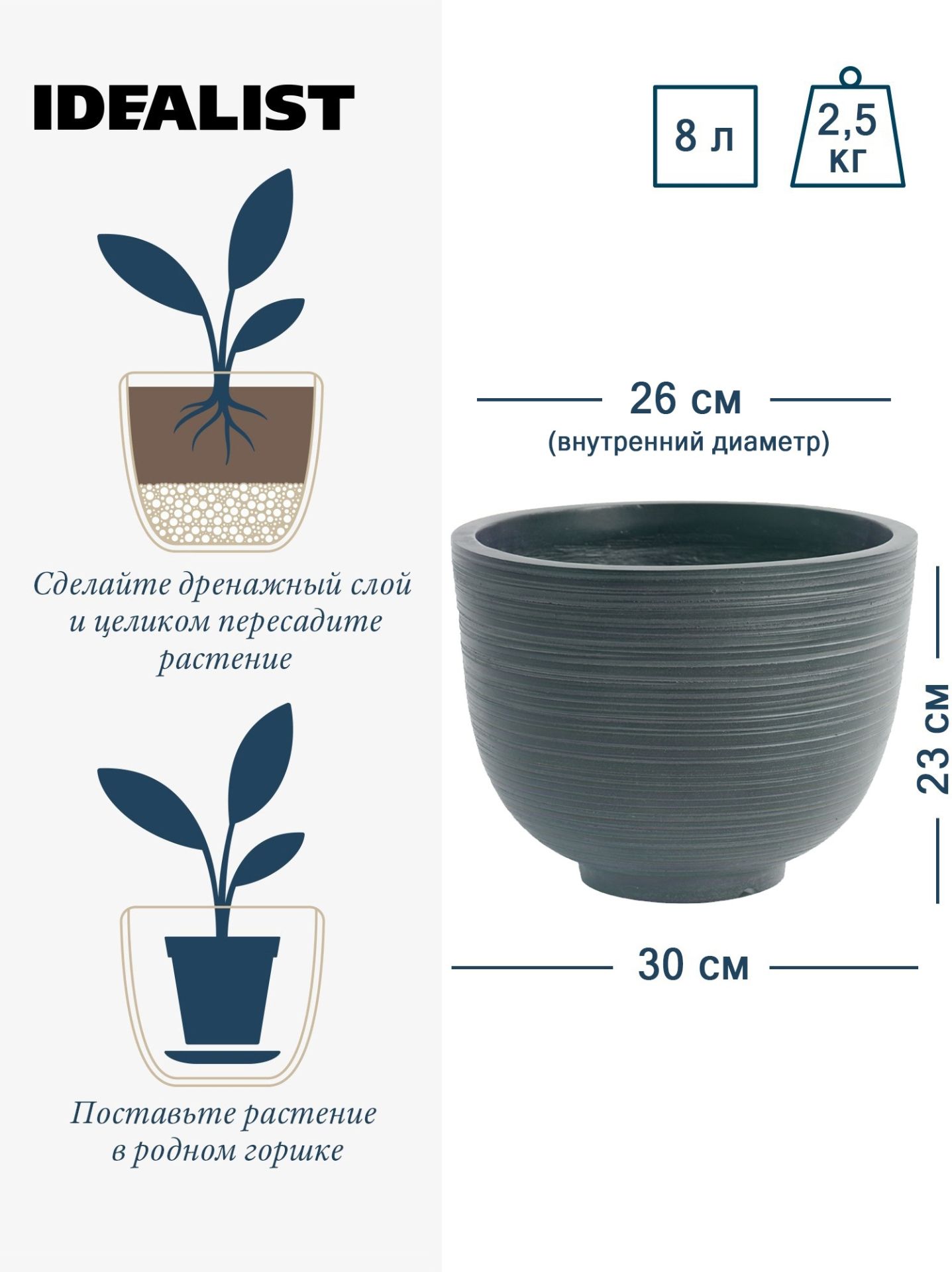 На дне кашпо (кроме моделей на ножках) есть метки для дренажных отверстий. Но просверливать их не обязательно. Вместе с кашпо вы получите печатную инструкцию с разными вариантами посадки, где не нужно утруждать себя сверлением.